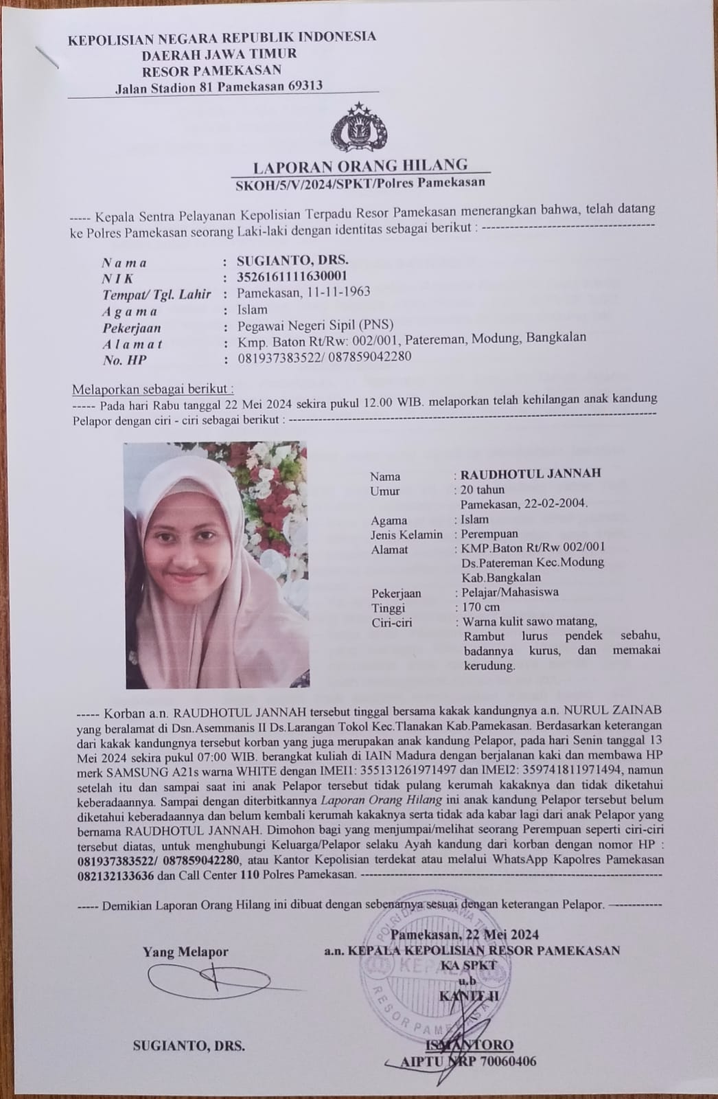 Namun sampai saat ini korban tidak pulang ke rumah kakak kandungnya bahkan tidak diketahui ke keberadaanya, sampai diterbitkan laporan orang hilang dengan no laporan SKOH/5/V/2024/SPKT/Polres Pamekasan.