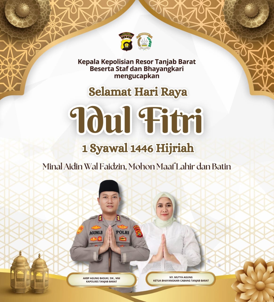“Mari kita manfaatkan momen ini untuk mempererat tali silaturahmi dengan keluarga dan sahabat.  Semoga Idul Fitri ini membawa kedamaian dan keberkahan bagi kita semua. Mohon maaf lahir dan batin” ungkap AKBP Agung Basuki, SIK., MM Kapolres Tanjab Barat.