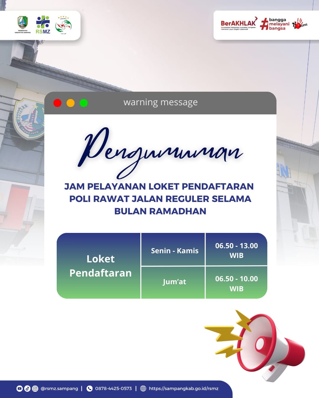 Selama Ramadan, poliklinik rawat jalan loket pendaftaran pada hari Senin-kamis mulai pukul 06.50 WIB hingga 13.00 WIB, sementara pada hari Jum’at mulai pukul 06.50 WIB, hingga 10.00 WIB. Sementara untuk pelayanan sampai selesai.